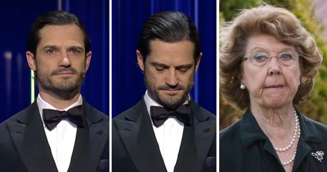 Prinsen var denna kväll klädd i dyster svart fluga – vilket går att tolka som en hyllning till avlidna faster Désirée. Hur som helst tog Skött till orda, och skickade kondoleanser å hela Idrottsgalans vägnar till Carl Philip och kungafamiljen.